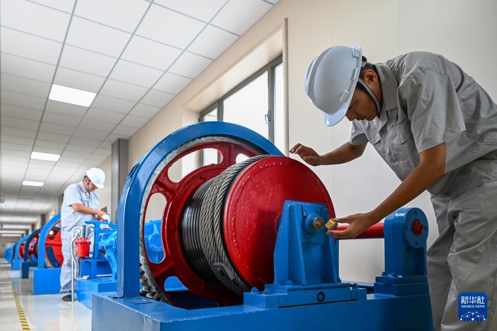 在新疆塔里木河干流乌斯满引水枢纽,才登巴(右)在闸房检查启闭机润滑油(8月13日摄)。