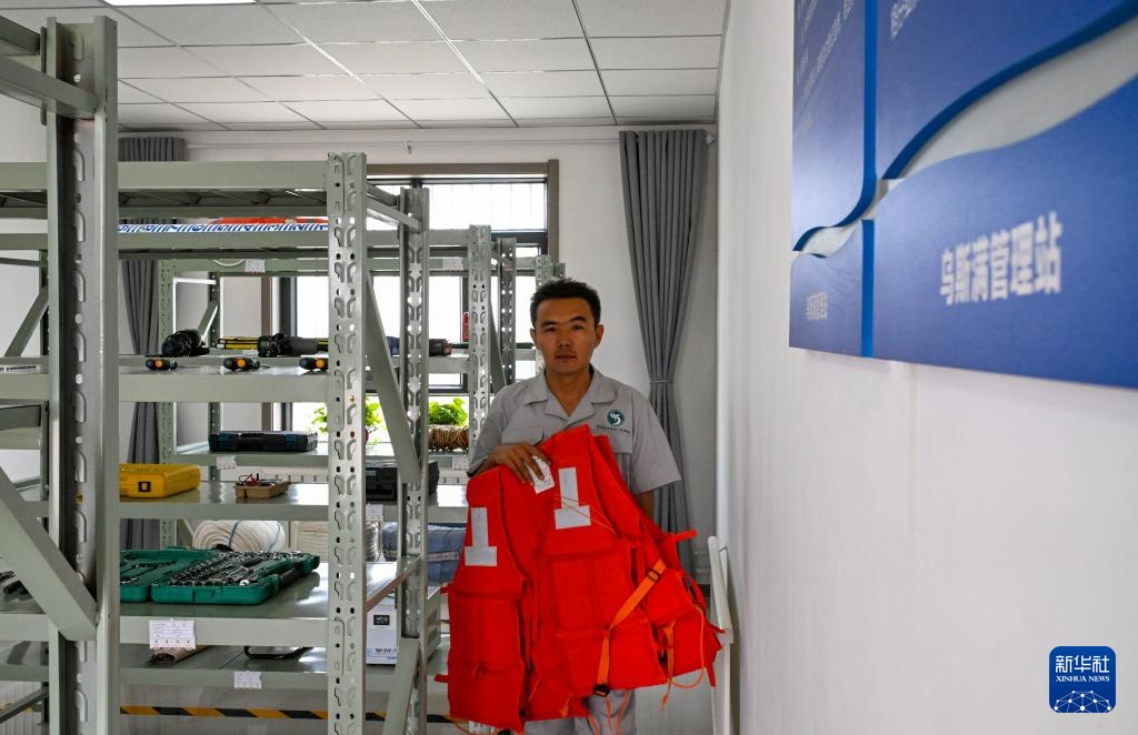 在新疆塔里木河干流乌斯满引水枢纽,才登巴在库房拿取救生衣(8月13日摄)。