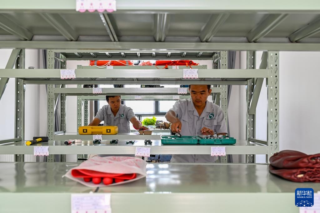 在新疆塔里木河干流乌斯满引水枢纽,才登巴(右)和同事王昕在库房检查保养日常工具(8月13日摄)。