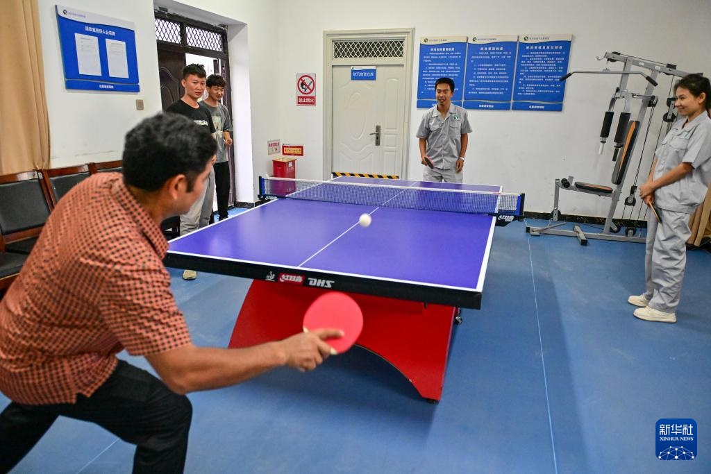 在新疆塔里木河流域干流管理局乌斯满管理站,工作人员在下班后打乒乓球放松(8月13日摄)。
