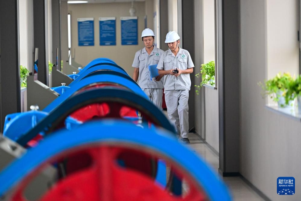 在新疆塔里木河流域干流乌斯满引水枢纽,才登巴(右)和同事王昕在闸房巡检(8月13日摄)。
