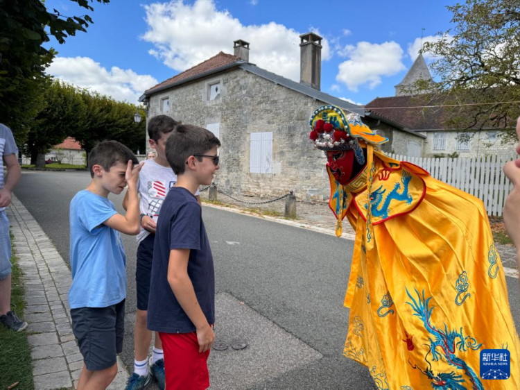 8月10日,来自中国湖南省韶山市的艺术家李雄(右)在法国科龙贝双教堂村的乡村艺术节上表演变脸(手机照片)。