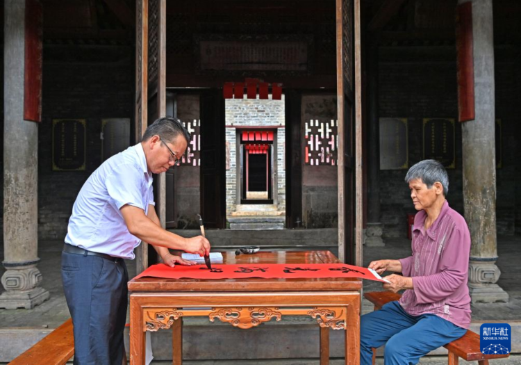 8月15日,一名楹联爱好者在大芦村古宅里写对联。