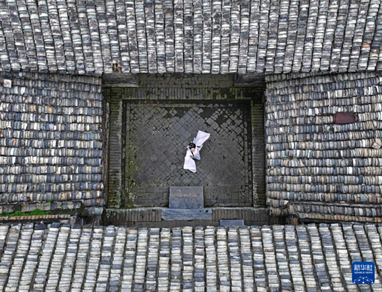 8月16日,一名身着汉服的游客在大芦村古建筑群里跳舞(无人机照片)。