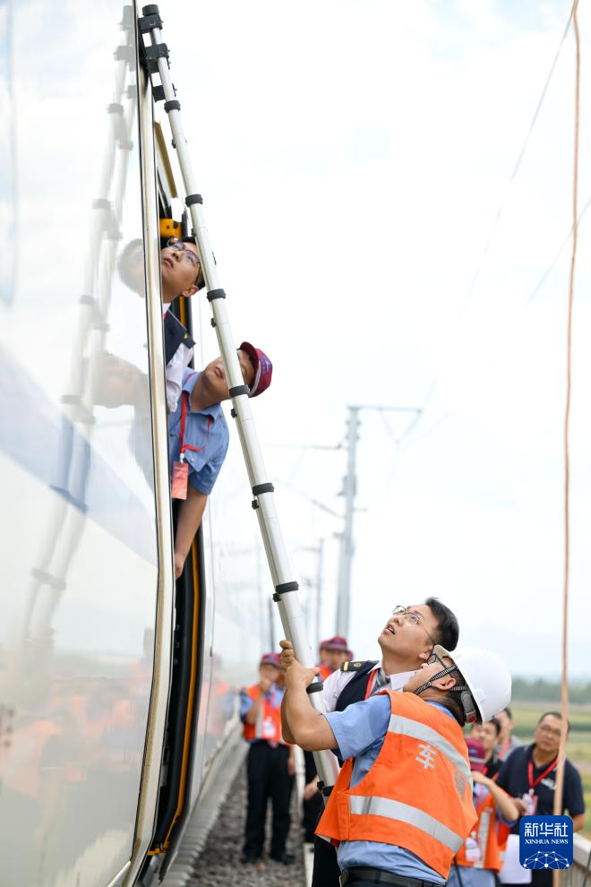 8月19日,兰州车辆段动车组随车机械师和列车长在搭设动车组登顶梯。