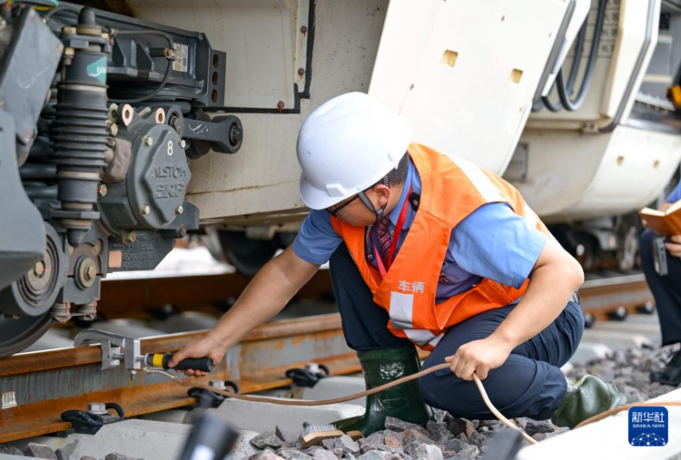 8月19日,兰州车辆段动车组随车机械师在搭设接地线。