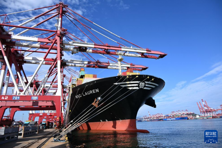 一艘远洋货轮在青岛港前湾集装箱码头进行装卸作业(8月6日摄)。