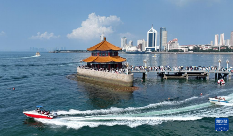 一艘快艇从青岛栈桥旁驶过(8月17日摄,无人机照片)。
