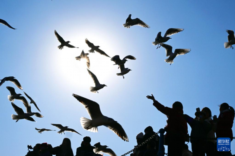 游客在青岛市市南区栈桥景区观赏海鸥(1月24日摄)。