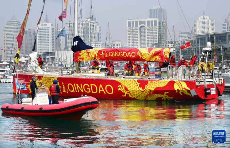 参加2023-24克利伯环球帆船赛的青岛号大帆船抵达青岛奥林匹克帆船中心(3月22日摄)。