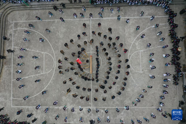 在融水苗族自治县杆洞乡尧告村,村民在拉鼓祈福(无人机照片,2022年12月7日摄)。