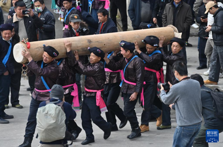 在融水苗族自治县杆洞乡尧告村,村民们在拉鼓祈福(无人机照片,2022年12月7日摄)。