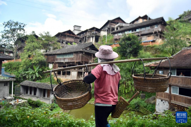 在融水苗族自治县杆洞乡尧告村,村民韦祥妈上山劳作(8月14日摄)。