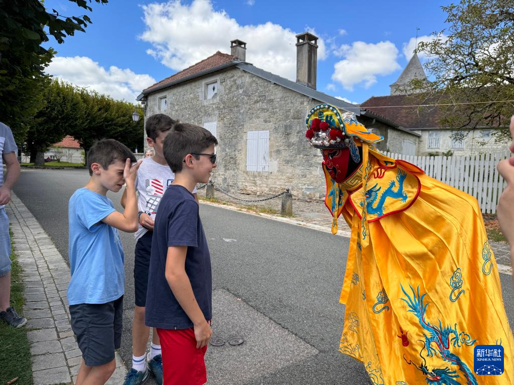 记者手记|当中法人文交流走进法国乡村 8月10日,来自中国湖南省韶山市的艺术家李雄(右)在法国科龙贝双教堂村的乡村艺术节上表演变脸(手机照片)。 新华社记者 罗毓 摄