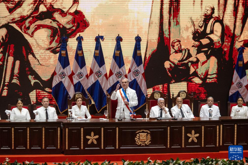 阿比纳德尔宣誓就任多米尼加总统 8月16日,在多米尼加圣多明各,阿比纳德尔(左四)宣誓就任多米尼加总统后发表讲话。 多米尼加当选总统阿比纳德尔16日在首都圣多明各宣誓就职,开启他第二个总统任期。 新华社记者 李木子 摄