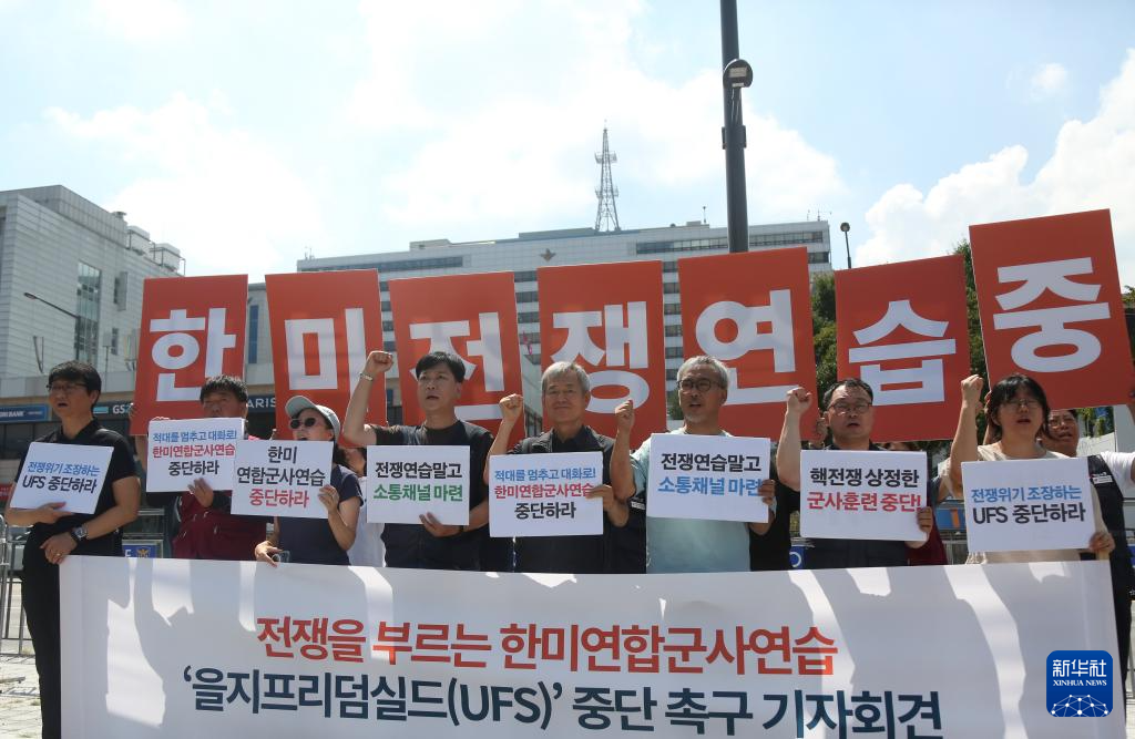 韩国民间团体抗议韩美联合军演 8月19日,韩国民众在首尔龙山总统府前举行抗议集会。 19日上午,“和平统一开创者”“朝鲜半岛和平行动”等韩国民间团体在首尔龙山总统府前举行抗议集会,要求立即停止韩美军队当天启动的联合军事演习。 新华社记者 姚琪琳 摄