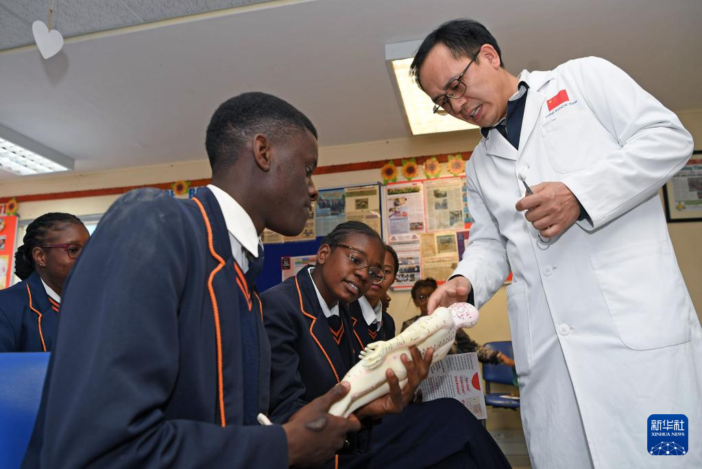中国援纳医疗队走进课堂传授中医文化 8月14日,在纳米比亚首都温得和克的一所私立学校,中国援纳第15批医疗队队长李邦伟在课堂上为学生们介绍人体经络。 当日,第15批中国援纳米比亚医疗队队员来到位于首都温得和克的一所私立学校,将针灸、火罐等作为教具,让30多名师生感受传统中医文化的魅力。 新华社记者 陈诚 摄