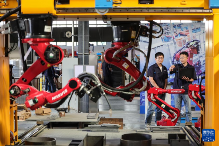 6月3日,在辽宁沈阳,沈阳新松机器人自动化股份有限公司的机器人研发工程师在讨论智能焊接机器人平台焊接方案。近年来,沈阳新松机器人自动化股份有限公司先后承担了“面向智能工厂的工业机器人关键技术及应用”“高性能真空机械手及传输平台研制”两项辽宁省创新联合体科技重大专项,实现在国产新能源汽车焊装线应用的重大突破,真空机械手实现在国产半导体装备关键环节的批量应用。