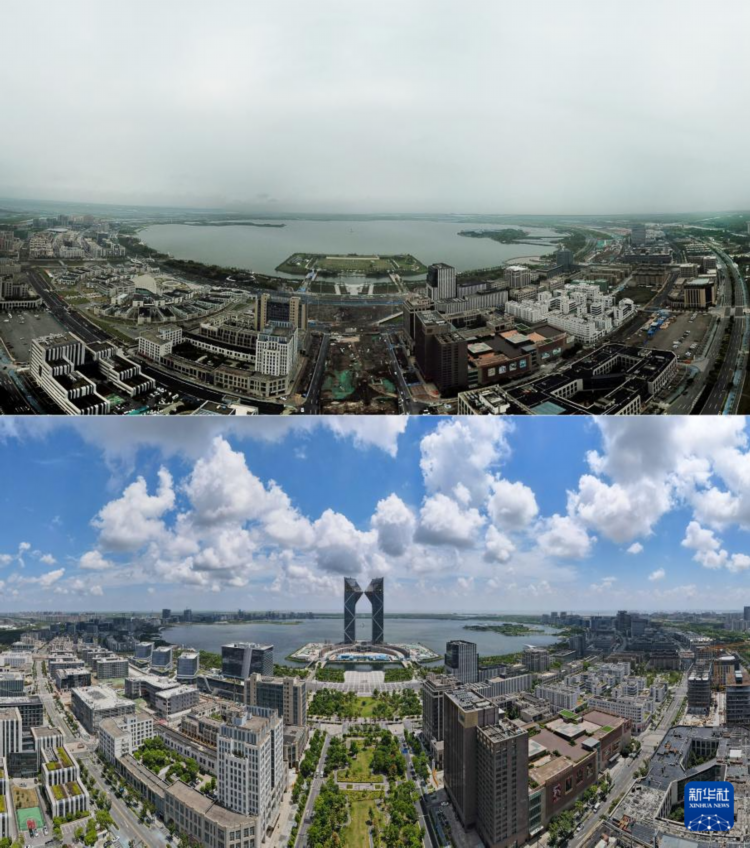 拼版照片:空中俯瞰临港新片区滴水湖(上图为2019年6月28日摄,无人机照片;下图为2024年8月14日摄,无人机照片)。