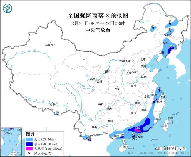 中央气象台8月21日06时发布暴雨蓝色预警: