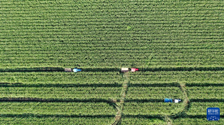 8月8日,在吉林省梨树县孤家子镇两家子村,农民收获鲜食玉米(无人机照片)。