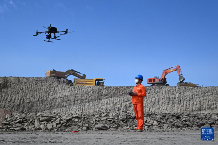 8月21日,在新疆准东宜化五彩湾一号露天煤矿,工作人员操控无人机对矿区进行测绘。