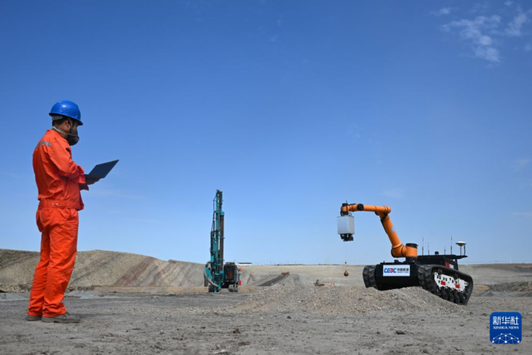 8月21日,在新疆准东宜化五彩湾一号露天煤矿,工作人员操控智能验孔机器人对钻孔进行检测。