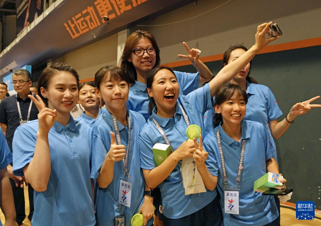 8月23日,奥运冠军陈芋汐(前排左一)亮相活动现场,与两岸青年合影互动。