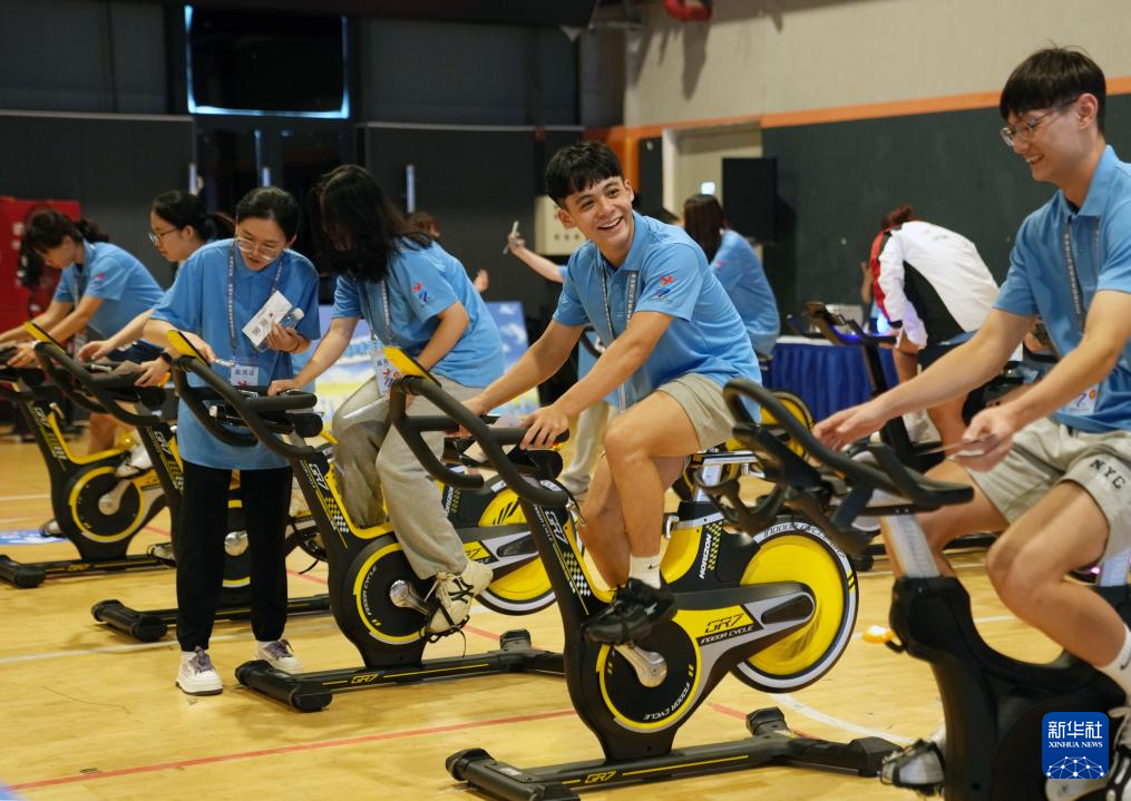 8月23日,两岸青年在现场参加动感单车竞速挑战赛。
