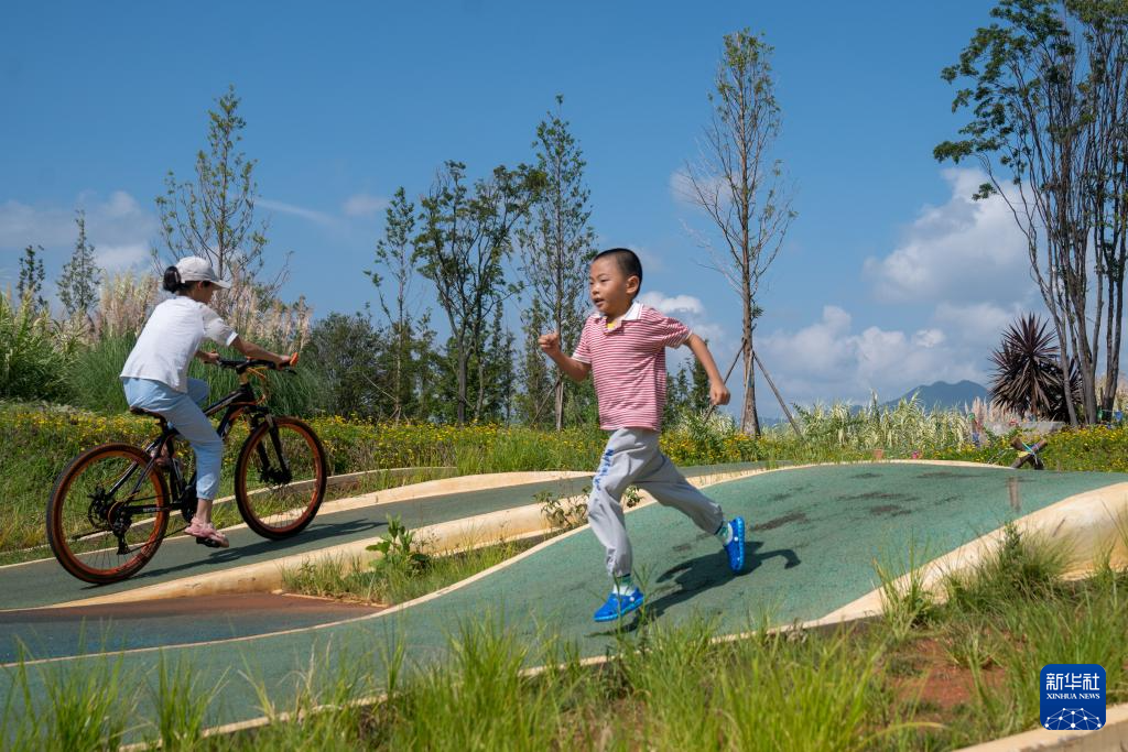 8月24日,孩子在昆明草海湿地公园内玩耍。