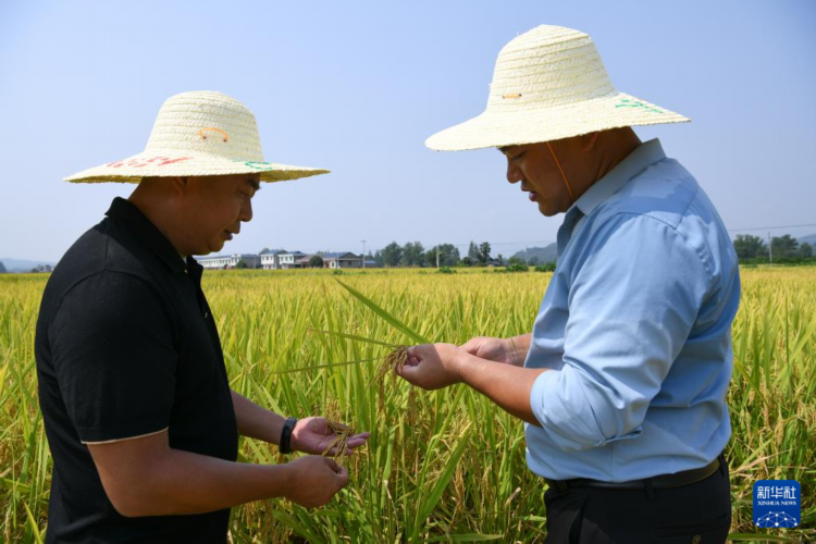 8月26日,在洪雅县“天府粮仓”止戈安宁万亩核心示范区,四川农业科学院作物研究所水稻专家朱从桦(右)与当地种植大户观察示范区内水稻情况。