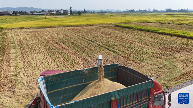 8月26日,在洪雅县“天府粮仓”止戈安宁万亩核心示范区,村民将收割的水稻装入货车(无人机照片)。
