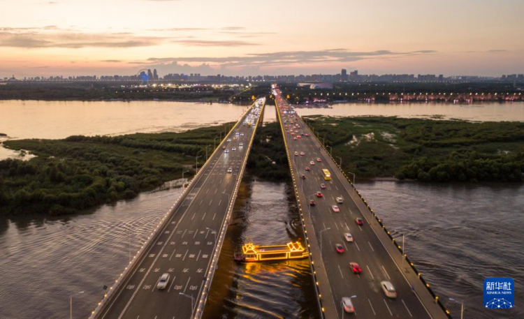 车辆在哈尔滨松花江公路大桥上行驶,一艘游船从桥下经过(8月15日摄,无人机照片)。