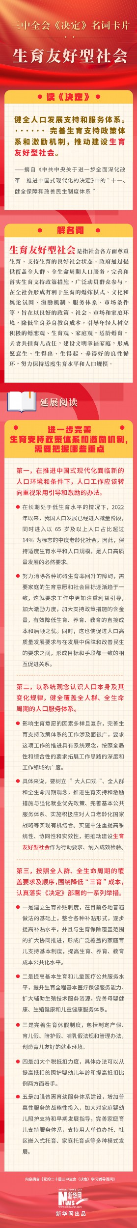 党的二十届三中全会审议通过了《中共中央关于进一步全面深化改革、推进中国式现代化的决定》。新华网依据《党的二十届三中全会〈决定〉学习辅导百问》,制作三中全会《决定》系列名词卡片,和大家一起来深入学习领会二十届三中全会精神。本期名词是“生育友好型社会”。