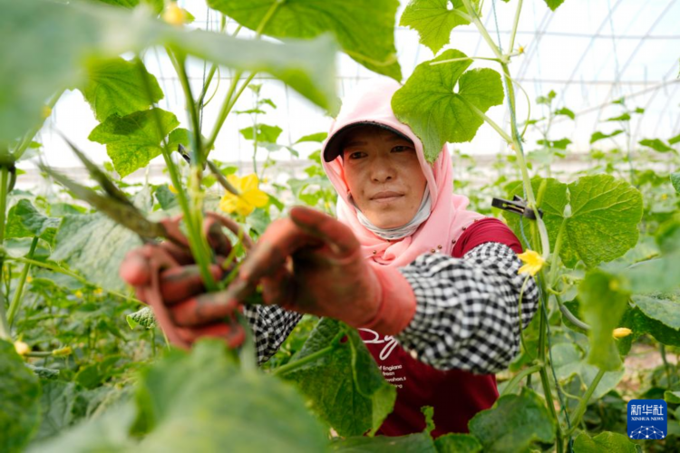 宁夏固原市原州区彭堡镇姚磨村瑞丰蔬菜产销合作社农户在温棚内为黄瓜掐秧(8月24日摄)。