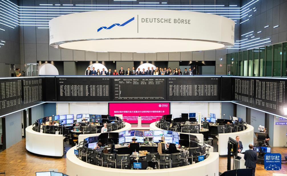 全球首只人民币SGS债券在法兰克福上市 8月26日,嘉宾在德国法兰克福证券交易所合影。 全球首只人民币SGS债券26日在德国法兰克福证券交易所上市。SGS是可持续发展挂钩贷款、绿色贷款和社会责任贷款三类贷款合集的简称。中国银行官网日前宣布,中行法兰克福分行SGS债券8月13日成功发行,规模为25亿元人民币,品种为2年期固息。 新华社记者 张帆 摄