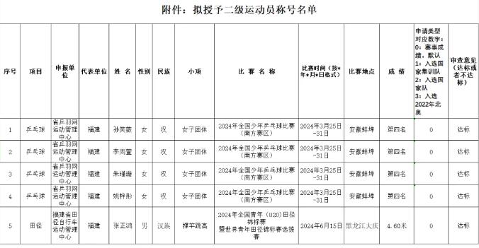 福建省体育局关于拟授予孙笑薇等5人(次)二级运动员称号公示的通知
