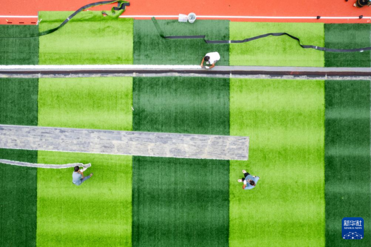 8月29日,在平江县桂花学校,施工人员对操场的人造草坪进行修复(无人机照片)。