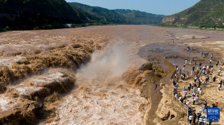 游客在黄河壶口瀑布景区游览(8月29日摄,无人机照片)。