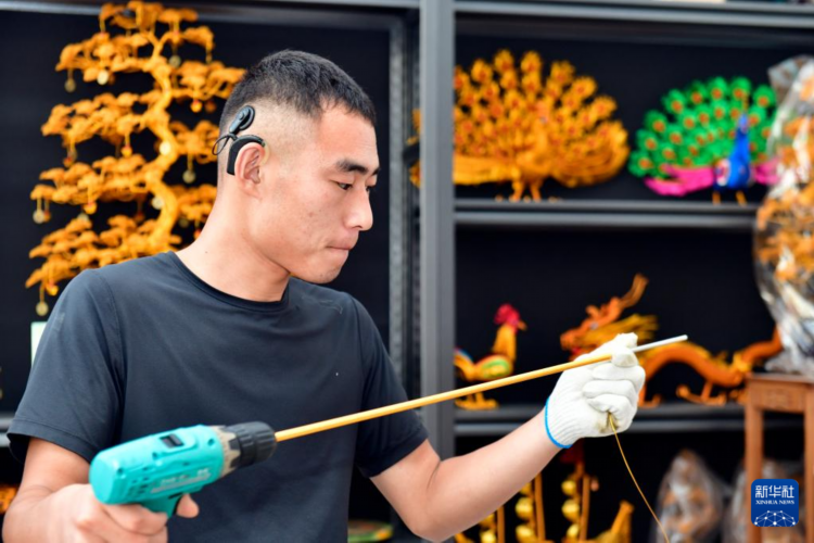 8月28日,在山东省滨州市惠民县辛店镇“如康家园”,残疾人在加工铝丝工艺品。