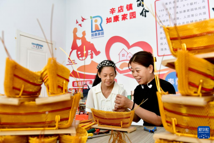 8月28日,在山东省滨州市惠民县辛店镇“如康家园”,工作人员孙广梅(右)在指导残疾人加工铝丝工艺品。