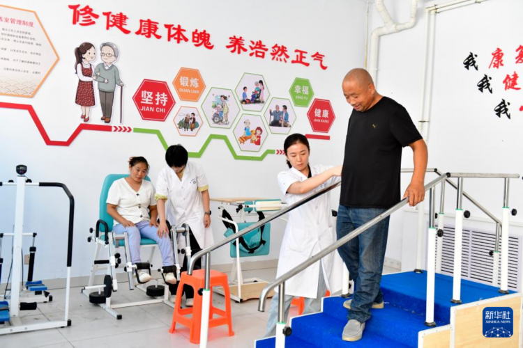 8月29日,在山东省滨州市惠民县辛店镇“如康家园”,工作人员在帮助残疾人进行康复训练。