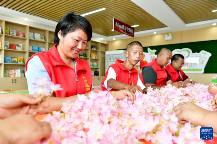 8月29日,在山东省滨州市惠民县胡集镇“如康家园”,残疾人在制作绢花。