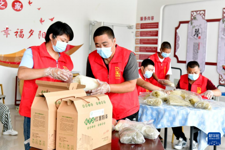 8月29日,在山东省滨州市惠民县胡集镇“如康家园”,工作人员和残疾人一起将粉条装箱。