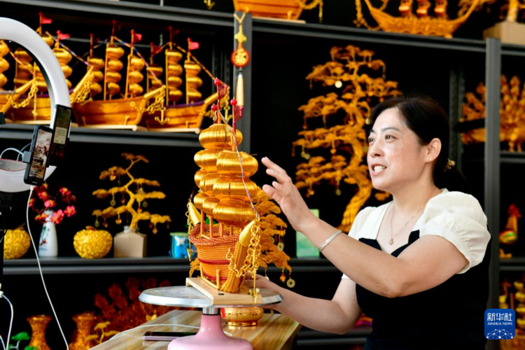 8月28日,在山东省滨州市惠民县辛店镇“如康家园”,工作人员康希芳直播销售残疾人加工的铝丝工艺品。