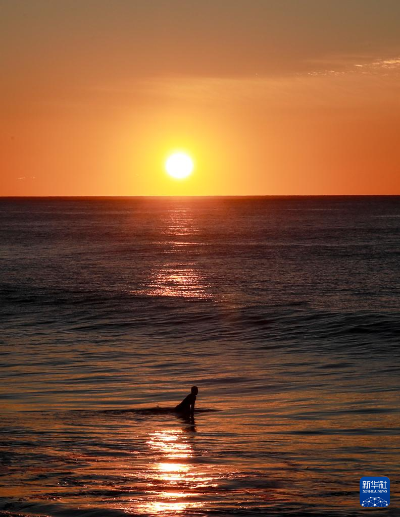 8月30日,一名冲浪者在日出时分的澳大利亚悉尼迪怀海滩等待波浪。