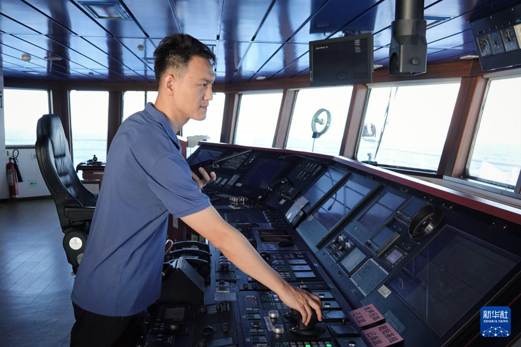 8月30日,船长赵鑫驾驶“深海一号”船抵达作业点,调整船舶航向姿态,协助“蛟龙号”布放下水。