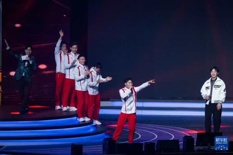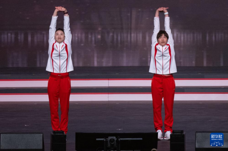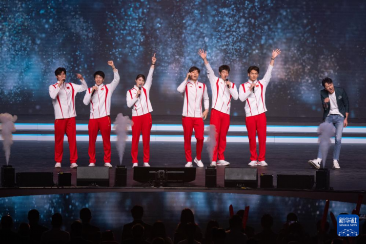 图为举重运动员、皮划艇运动员和曲棍球运动员献唱歌曲《奔跑》。新华社记者 张金加 摄