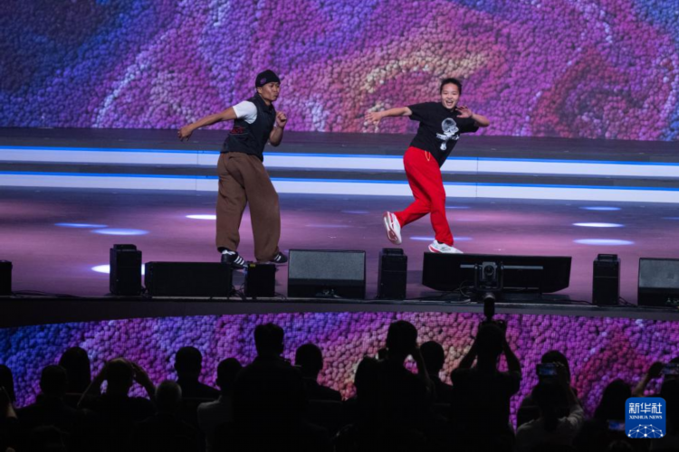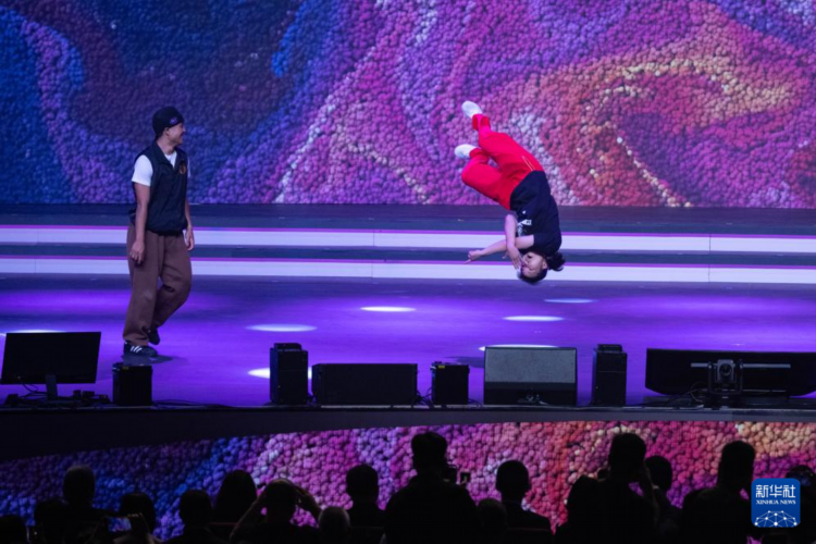 图为霹雳舞运动员刘清漪(右)与澳门运动员同场竞技。新华社记者 张金加 摄