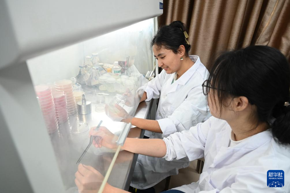 8月20日,福建农林大学学生古丽则巴·尼牙孜(左)和同学在福建农林大学国家菌草工程技术研究中心进行巨菌草的脱毒苗组培工作。